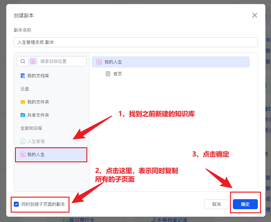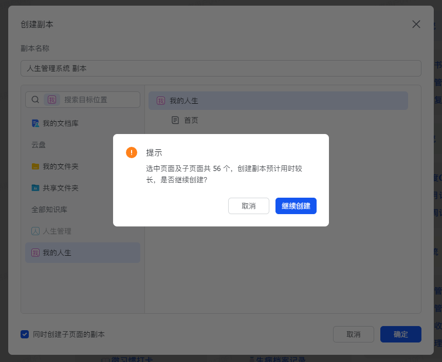 注意:图片左下角【同时创建子页面的副本】记得勾选,不勾选文档不能编辑!