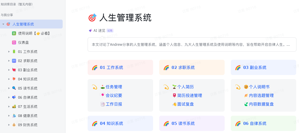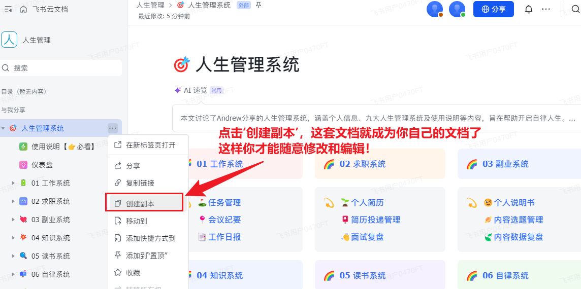 注:不要申请编辑权限❗️你必须将【人生管理系统】保存为你的飞书文档,样才能自由编辑文档👏
