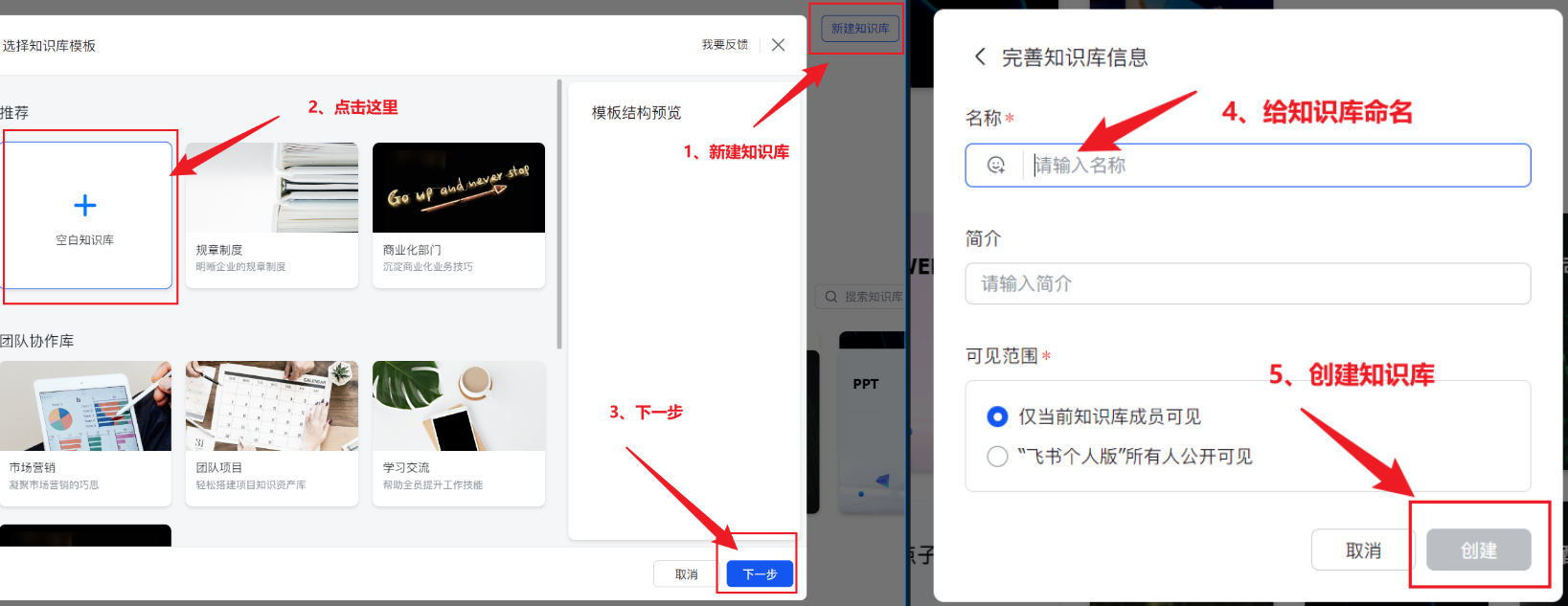 右上角【新建知识库】--点击【空白知识库】--点击【下一步】--给知识库命名--【创建】
