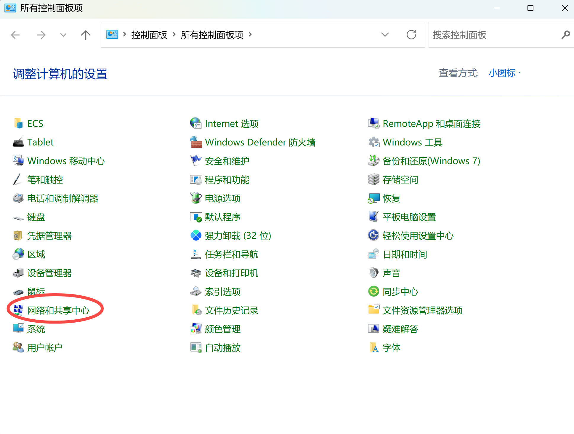 3、打开控制面板,确认“移动热点”的名字,例如下方的“本地连接1”